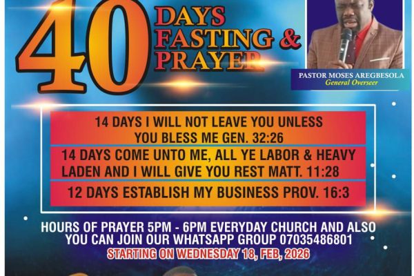 40 DAYS FASTING & PRAYER (CITY OF GILGA JOS:5:8) 14 DAYS I WILL NOT LEAVE YOU UNLESS YOU BLESS ME. (GEN. 32:26) 14 DAYS COME UNTO ME, ALL YE LABOR & HEAVY LADEN AND I WILL GIVE YOU REST (MATT. 11:28) 12 DAYS ESTABLISH MY BUSINESS (PROV. 16:3) HOURS OF...
