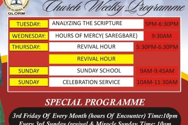 Sunday Service – Nigeria (9am – 12noon) Join us for a miraculous encounter this coming Sunday at Global Revival Ministry. It will be a beautiful life-changing service in God’s presence. Sunday School: 9:00am – 9:45am Celebration Service: 10am – 11:30am Special Sunday: 1st Sunday. Thanks giving Sunday 3rd Sunday; Revival...